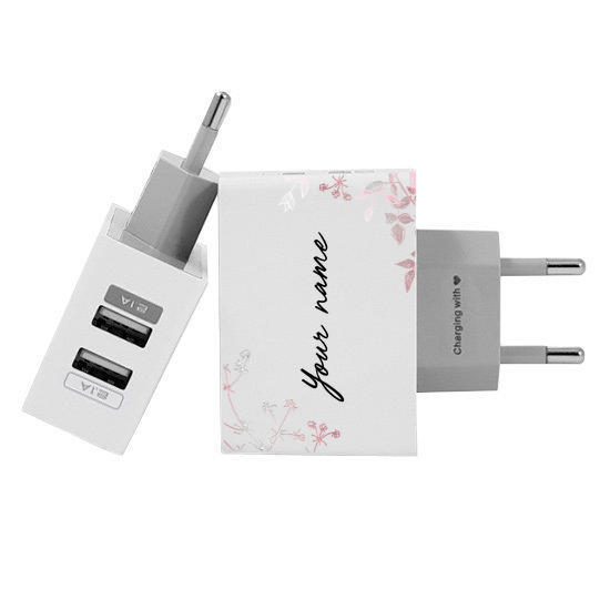 Customized Dual Usb Wall Charger for iPhone and Android - Rosé Branch Handwritten White (EU plug compatible)